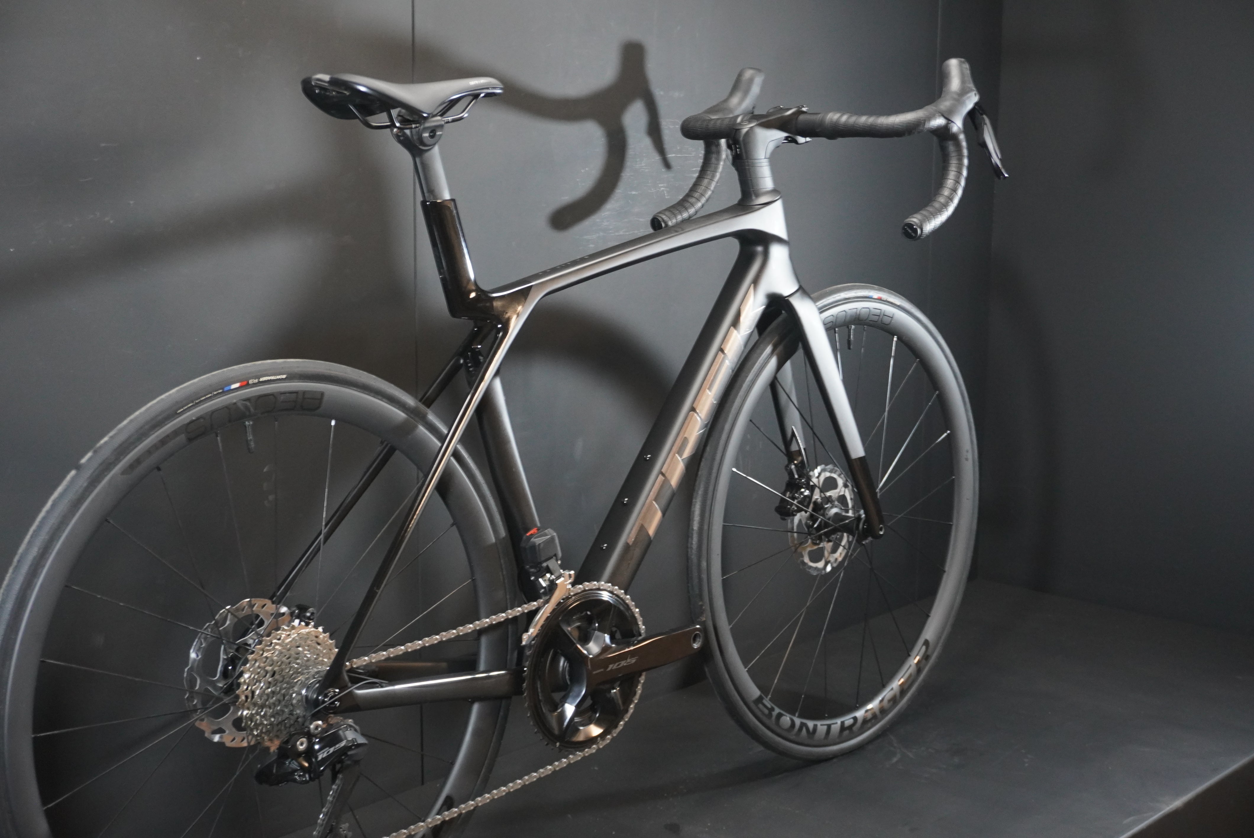 Fork: Madone Gen 8 full carbon, tapered carbon steerer, internal brake routing, flat mount disc, 12x100mm chamfered thru axle